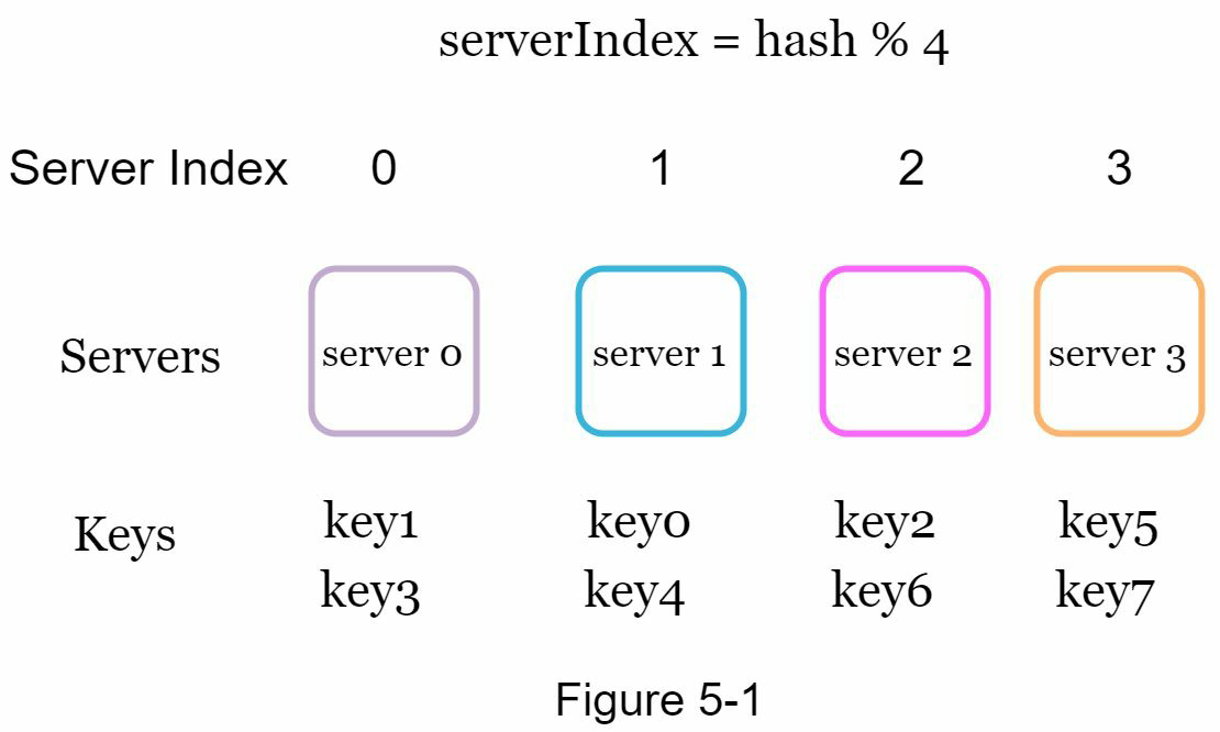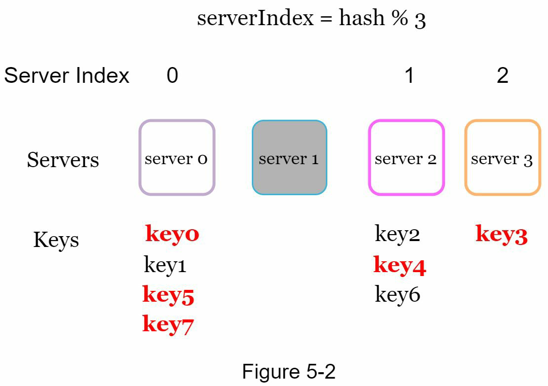 e.g. 1번 서버가 동작을 중단한 경우, 대부분의 키가 재분배되어 대규모 캐시 미스 발생