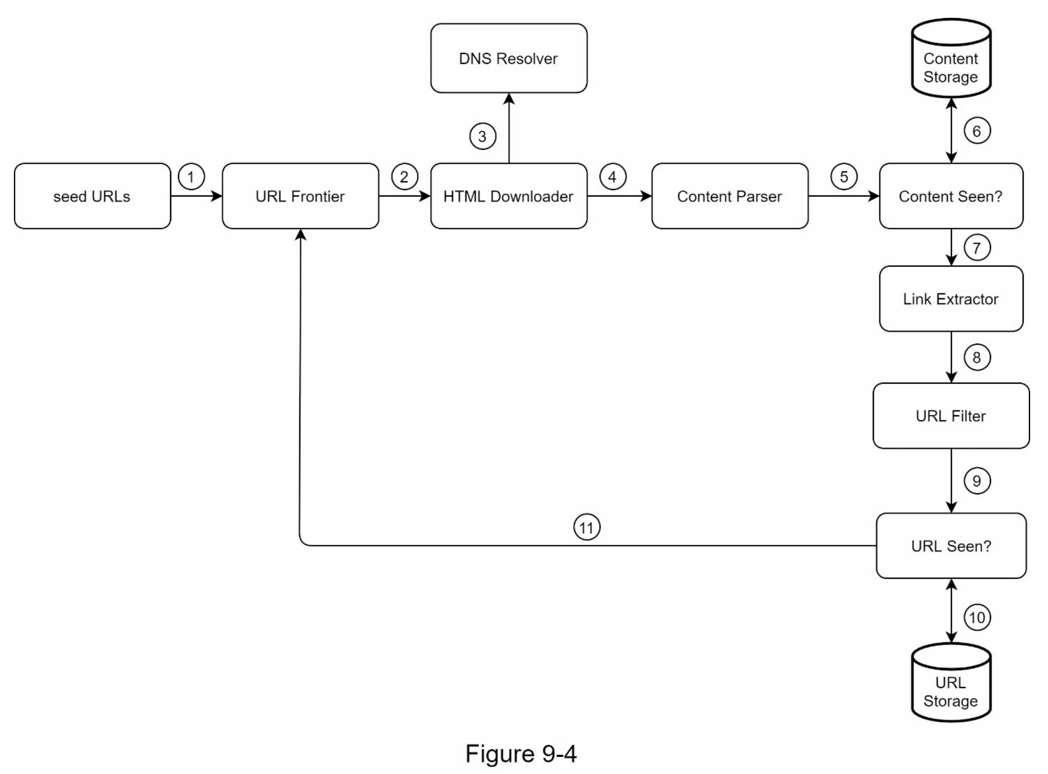 - HTML 다운로더가 도메인 이름 변환기를 호출하여 각 URL의 IP 주소를 얻은 뒤, 다운로드를 시작