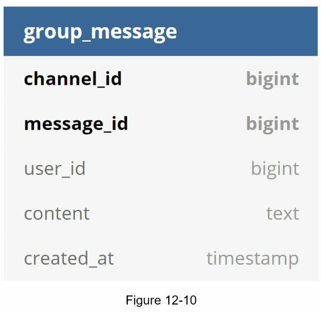 - channel: 채팅 그룹, partition key로도 사용